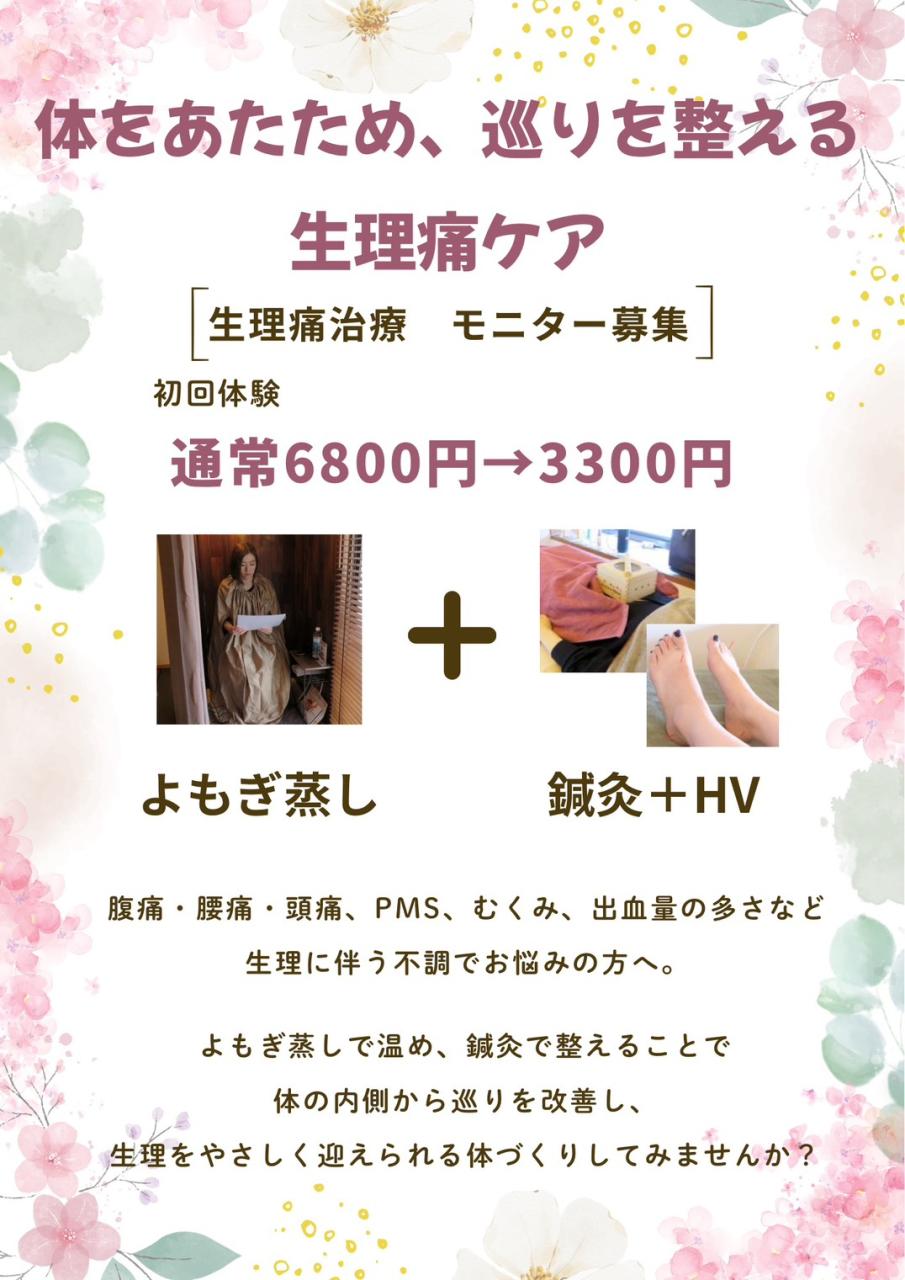 当院では、よもぎ蒸し+鍼灸を組み合わせた 生理痛治療セットを作りました。 よもぎ蒸しで体の内側からしっかり温め、